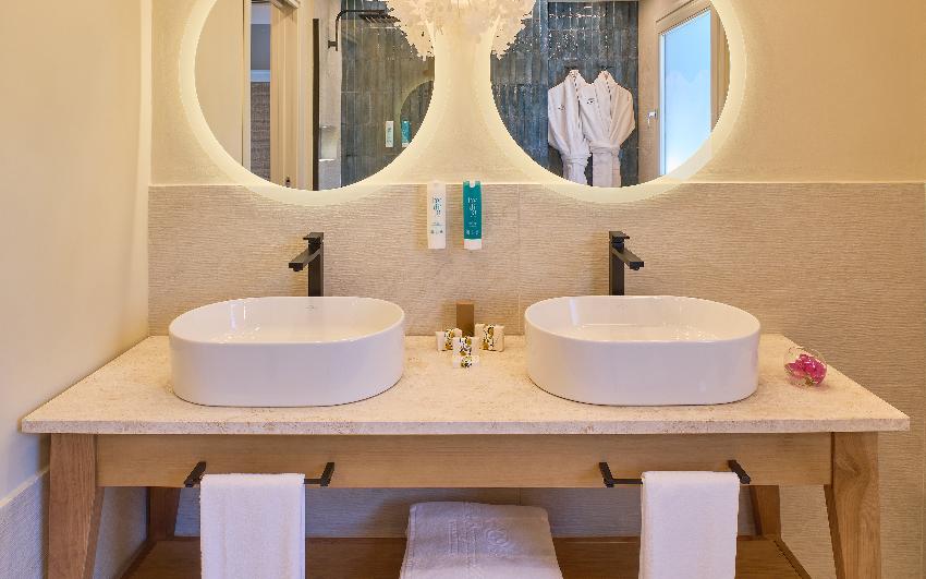 The suite is distinguished by large windows that flood the rooms with natural light, creating a warm and inviting atmosphere. The private patio, equipped with outdoor furniture, allows for enjoyable moments outdoors, while the surrounding large garden offers an intimate corner of peace to relax. The modern and refined furnishings, combined with the great openness to the outside, make this suite perfect for those seeking space, comfort, and direct contact with nature.